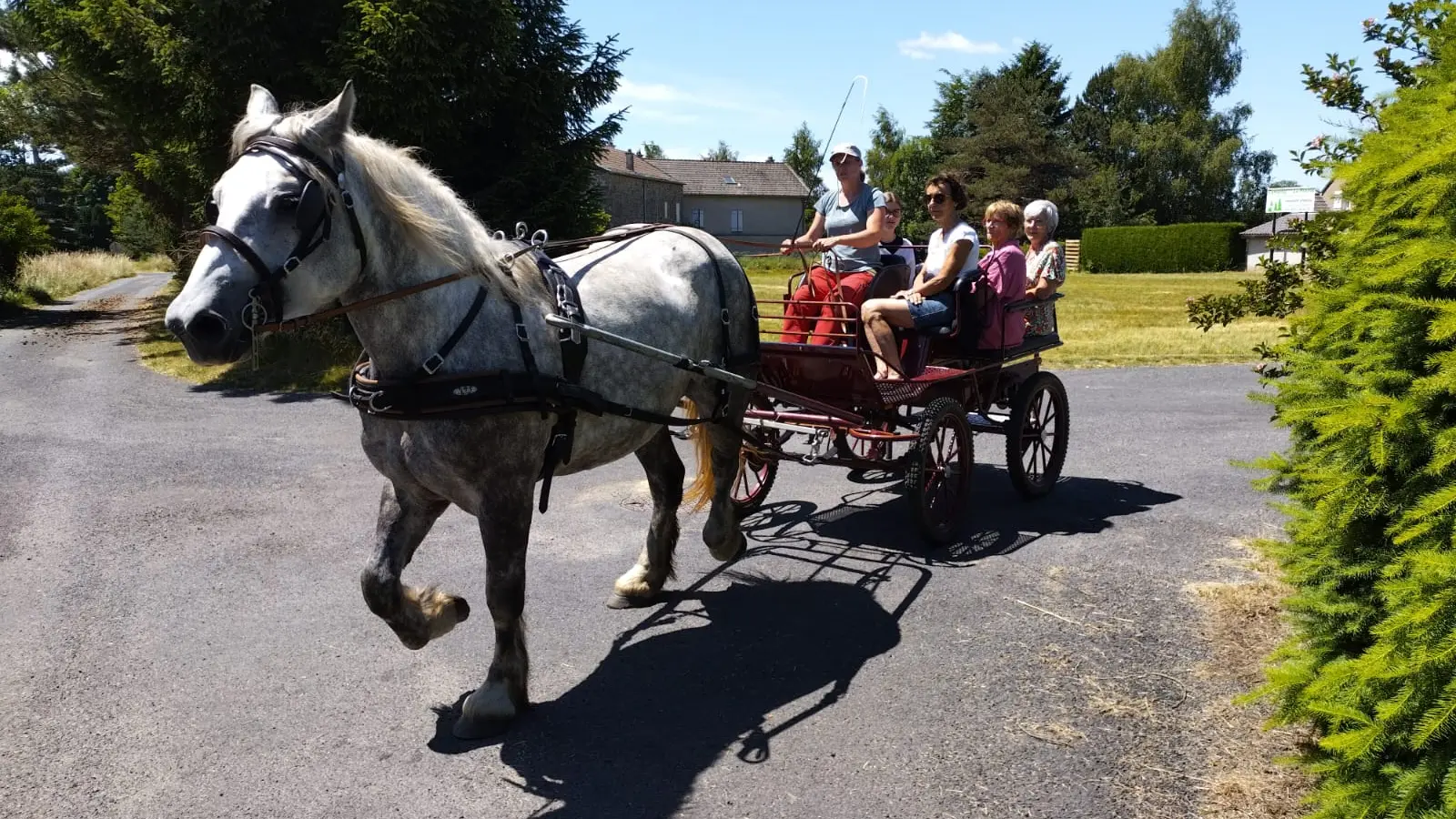 La calèche est privatisée et peut transporter jusqu'à 5 adultes. Les enfants de moins de 3 ans sont sur les genoux d'un adulte. Les enfants doivent être accompagnés par un adulte.