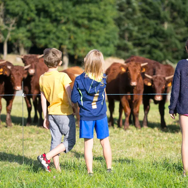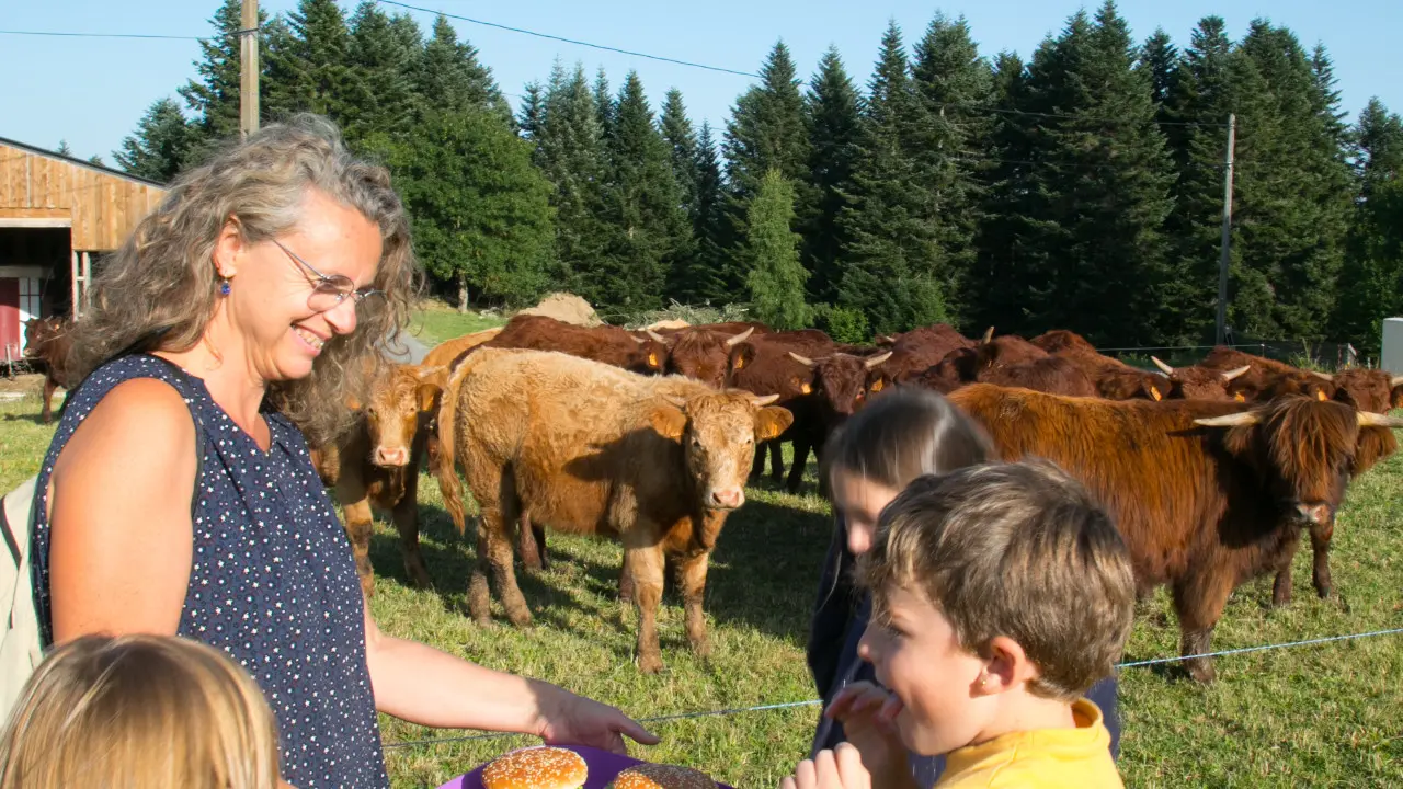 Eleveurs de bovins de race rustique (Salers) nous appliquons des pratiques raisonnées pour vendre en circuit court une viande de qualité. Notre gite à la ferme (chalet bois) est mis parfois en location mais il sert d'abord à accueillir des enfants suivis par l'Aide Sociale à l'Enfance sur des we et vacances. L'objectif est de leur offrir une "parenthèse nature" auprès des animaux, au rythme des saisons pour leur redonner confiance en leurs capacités.